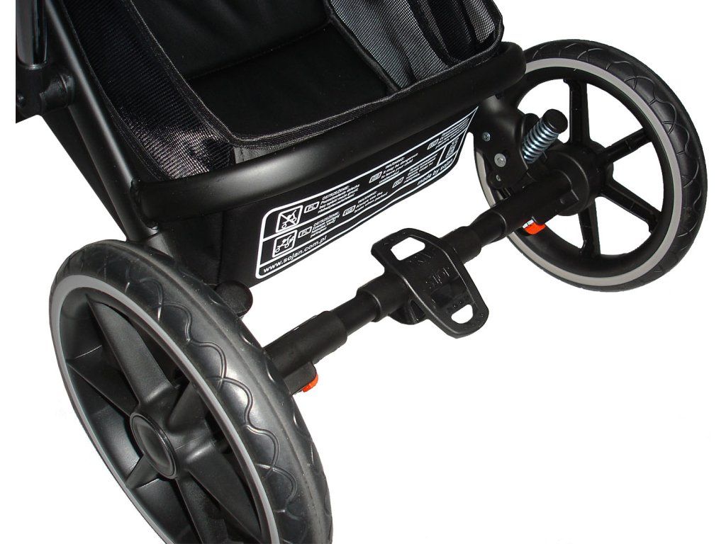 - Vysoká kvalita a funkčnost – Kočárek nabízí komfortní jízdu díky odpruženým kolům, otočným předním kolům s aretací a centrální brzdě pro bezpečí.
